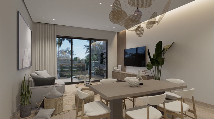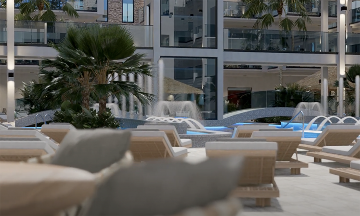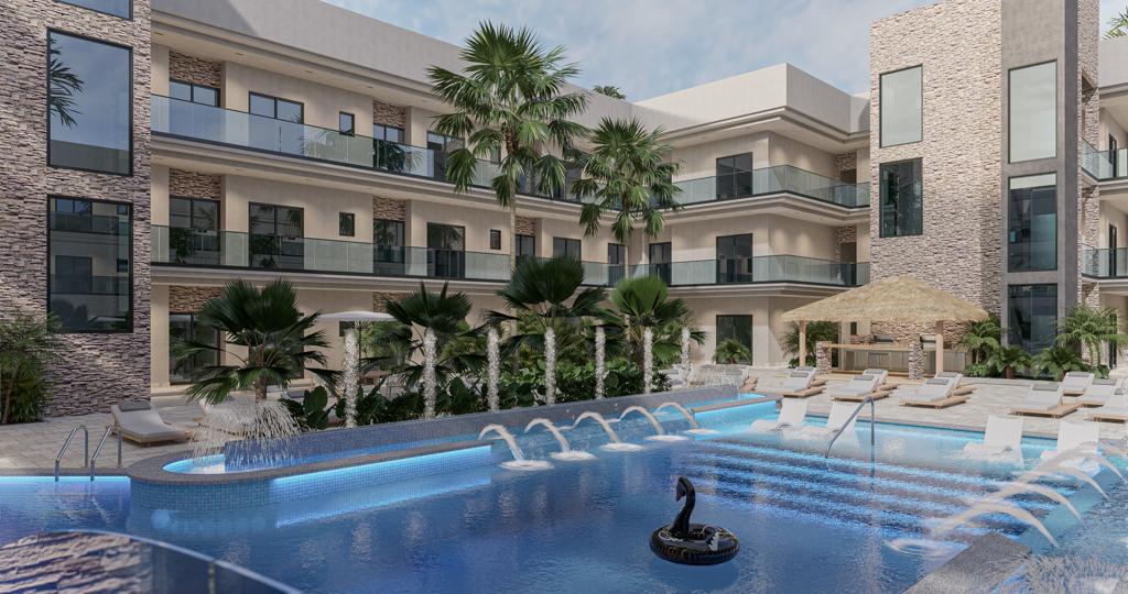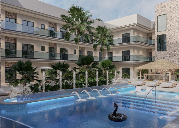 On the adjacent land of the main building, a 1st floor level “private locker room” and a 2nd floor level “gym,” accessible via a stairway, will be in place. Mailboxes will be placed in the front fence of the building. At the front of the building, one (1) remarkable wide entryway will be in place to give access to the stairs (3x) and/or elevators (2x) for vertical transportation of persons to the units at all levels. One elevator (8 persons) will be attached to the building, and the main elevator (16 persons) will be detached and will be accessible via bridges over the pool waterline. This elevator car will land into the swimming pool and give the illusion that you are in the water. All other entry access areas are connected to a covered hallway in front of all units at the 1st floor level. Each unit has its own main entrance and is projected as swinging doors and/or sliding doors. The above-mentioned units will be divided by a fire-rated wall (CMU) of minimum 2 hours. Each unit will receive its own electric meter by ELMAR to supply electrical provision throughout the unit. Each unit will receive its own water meter by W.E.B to supply water provision to the several fixtures.